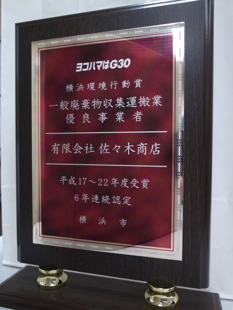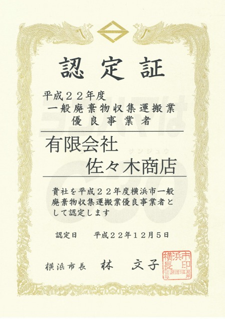 横浜市から、一般廃棄物収集運搬業優良事業者の